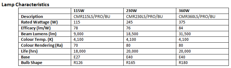 Available in a range of wattages including 115W, 230W and 360W, the range is ideal for use with EYE Lighting’s Compact and Watchman/Sodium Security floodlight products.