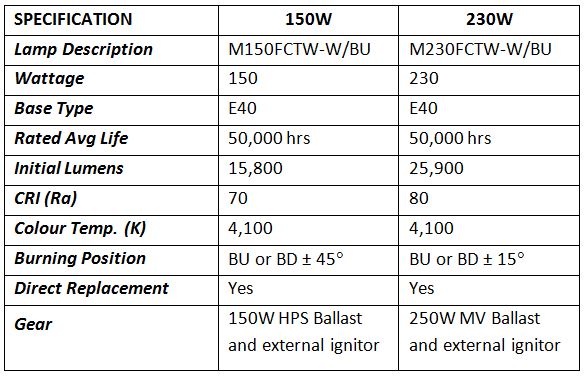 Comparable LED cost saving benefits are achieved with this lamp that packs a punch of 112lm/W (230W version) of high colour rendering (CRI 80) light with a colour temperature of 4,100K and an incredible service life up to 50,000 hours. In terms of lumen output, as a quick guide the 150W lamp is equivalent to a standard 250W metal halide lamp and the 230W version similar to a 400W metal halide lamp. Clear energy savings are in the region of 40%.