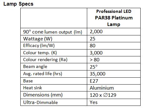 Another feature of the Platinum LED PAR38 lamp is the latest dimming technology providing excellent compatibility with most leading and trailing edge dimming systems.