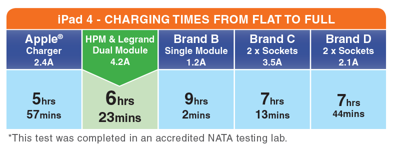Each double GPO contains a dual USB charging module. Both sockets within the module have 2.1A charge rates (4.2A in total), the fastest on the market. This means tablets can be charged efficiently too.