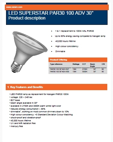 - PAR30 line-voltage LED reflector lamps with E27 retrofit screw base