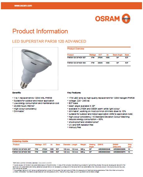 - PAR38 line-voltage LED reflector lamps with E27 retrofit screw base